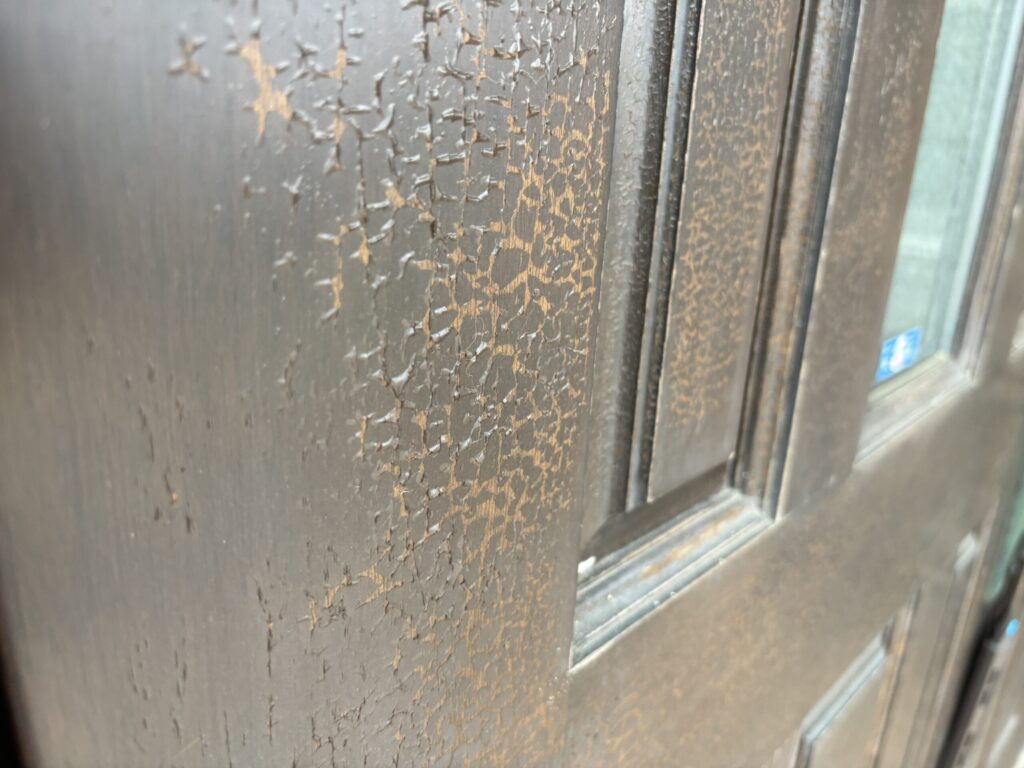 木製の玄関ドアです。前回塗膜がリフティング(シワシワ)を起こしています。ケレン後、専用塗料にて塗装します。